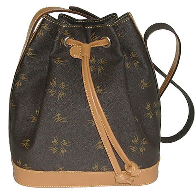 Bolso mujer tipo judas en genero de fantásia marrón con letras doradas combinado con piel de vaquetilla; en base, bandolera y fruncidor, color natural. Bolsillo interior de cremallera.